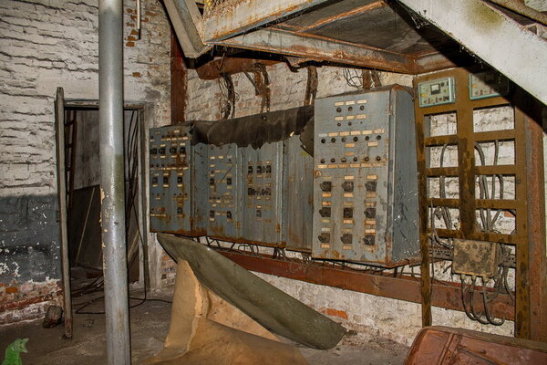 Рядом, у стены, чудом сохранился пульт управления этим конвейером. Замёрзшие тумблеры и потухшие лампочки — всё это когда-то было центром управления сложным процессом.