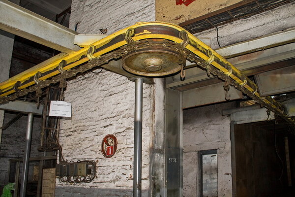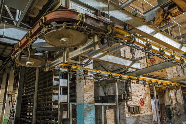 Когда-то на эти прочные крюки подвешивали детали автомобилей (вероятно, для военной техники), и они медленно двигались по замкнутому маршруту, проходя различные этапы обработки. Сложно сказать точно, какие именно операции здесь выполнялись — возможно, это была покраска, обезжиривание или сушка. История умалчивает об этих деталях, оставляя простор для воображения.