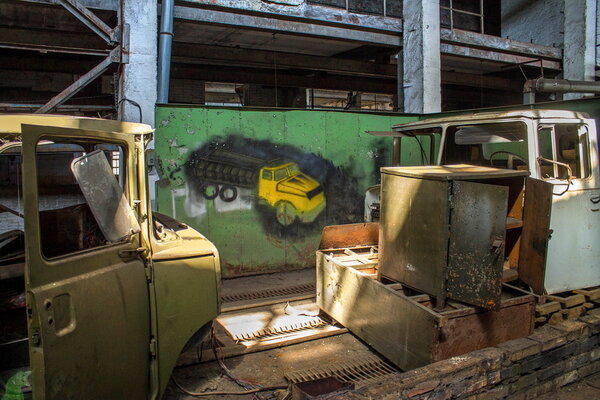 Смежный цех, куда, вероятно, отправлялись обработанные детали, уже постигла печальная участь — он распилен. Вокруг разбросаны кабины от грузовиков, а между ними кто-то оставил своё творчество — рисунки или надписи, добавляющие меланхоличную нотку в общую картину.