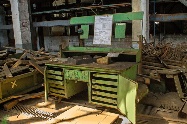 В углу примостилось чьё-то бывшее рабочее место. Сейчас это просто стол и стул, заваленные хламом, но когда-то здесь сидел человек, контролировавший часть производственного цикла.