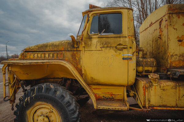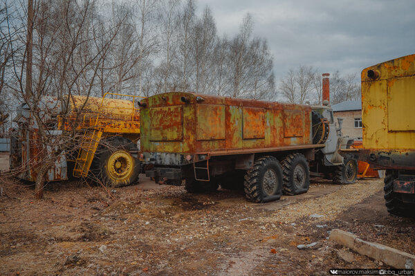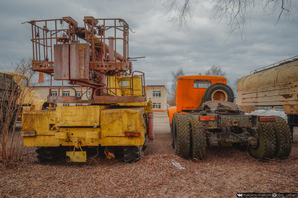 Рядом стоит КРАЗ с автовышкой. Даже сиденье в кабине уже не избежало нашествия зелени — оно основательно поросло мхом.
