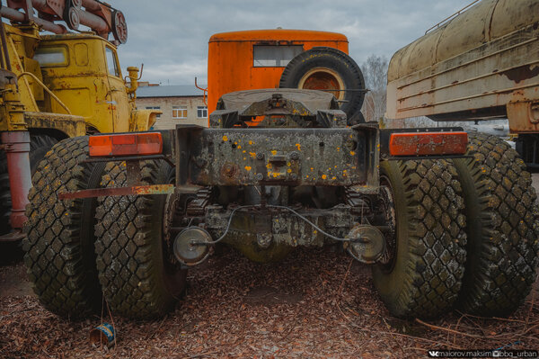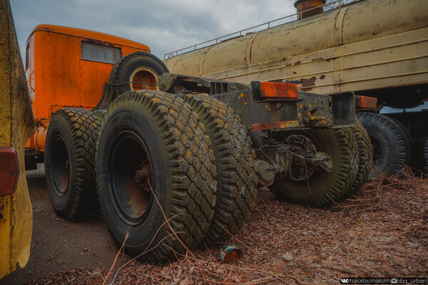А этот КРАЗ, судя по всему, стоит здесь очень давно. Природа уже начала неумолимо отвоевывать свою территорию — обратите внимание, как мох и трава прорастают прямо в протекторе покрышек.