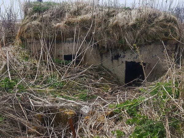Вид с башенной позиции. Вблизи виден заросший вход, а неподалёку торчат останки ржавой походной кухни.