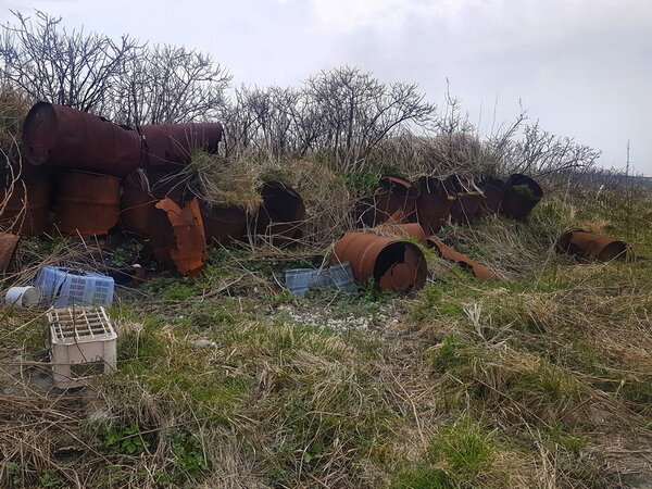 Рядом гниют останки напрочь проржавевших старых бочек.