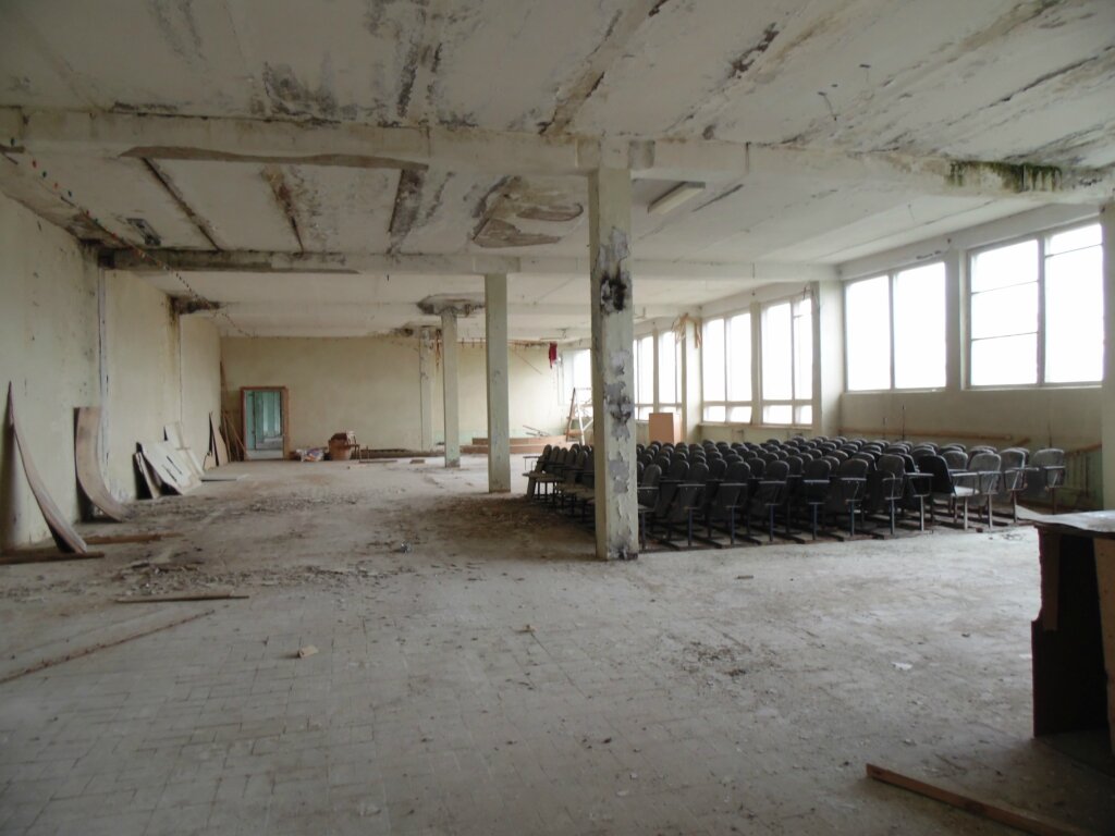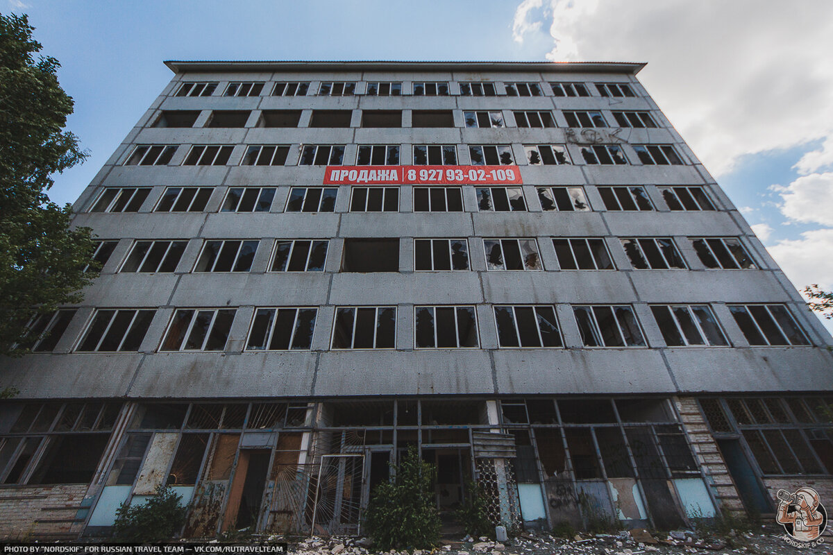 Заброшенное семиэтажное здание заводской администрации, зияет разбитыми окнами. На фасаде лаконичное объявление о том, что завод продаётся, но кому понадобиться огромная бетонная коробка с напрочь уничтоженными коммуникациями?