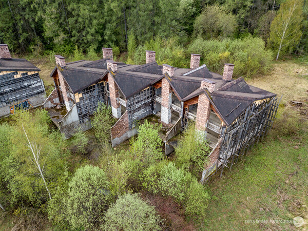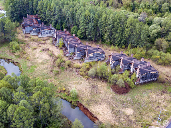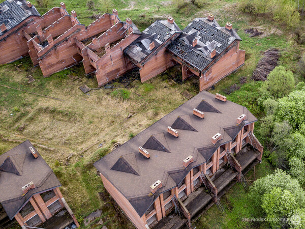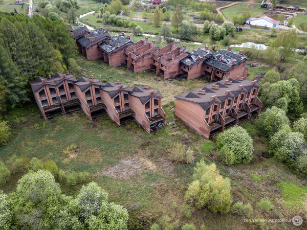 Честно говоря, я бы никогда не поверил, если бы мне рассказали о таком. Среди ухоженной лесной поляны стоят роскошные коттеджи, которые, судя по всему, так и остались недостроенными.