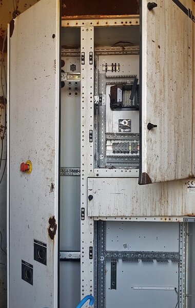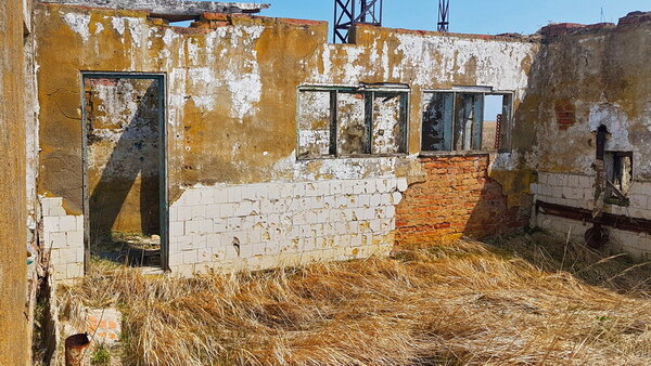 Из стены здания торчат, словно рёбра, остатки ржавых выхлопных труб от дизель-генераторов.