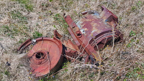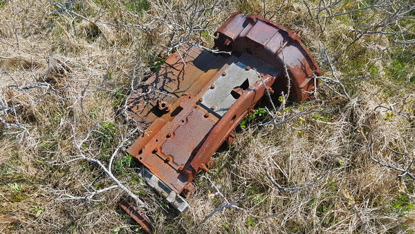 Рядом с развалинами валяются ещё два двигателя, давно ставшие частью пейзажа.
