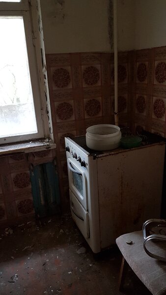 Кухня в одной из квартир. Обои отклеиваются, шкафы пусты, но плита и раковина на своих местах, будто ждут хозяев.