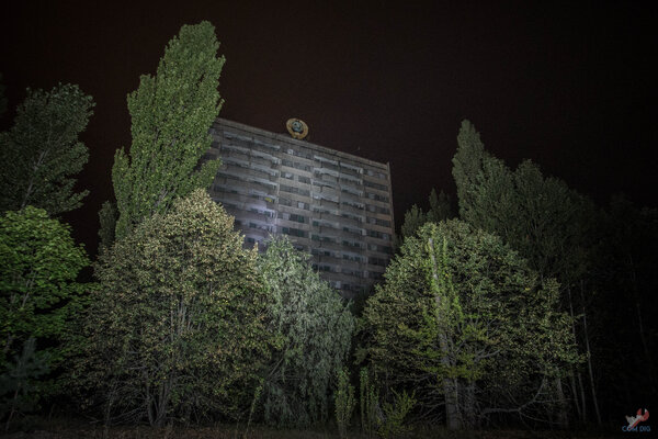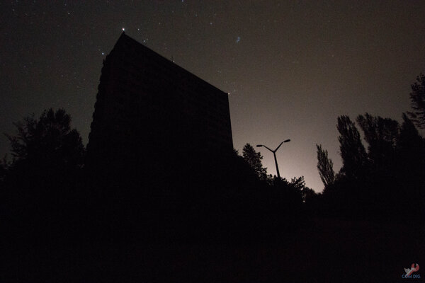 Ночью можно позволить себе дольше светить фонариком, но это может кого-то напугать. Однажды, когда мы осветили «гербовую шестнадцатиэтажку» для фото на длительной выдержке, на улицу, возможно, не вышел отряд сталкеров. Они не знали, кто мы такие. Щёлкнул затвор, фонарь погас, и город снова погрузился во тьму. Если за нами кто-то следил, то он потерял нас — мы растворились в темноте, уйдя в неизвестном направлении. Не исключено, что после нашего ухода кто-то осторожно спускался с крыши этого здания, ведь днём оно популярно у туристов, а ночью — у сталкеров.