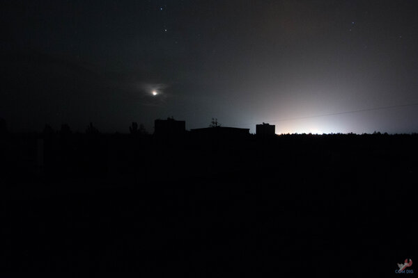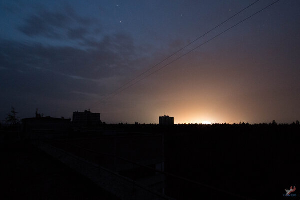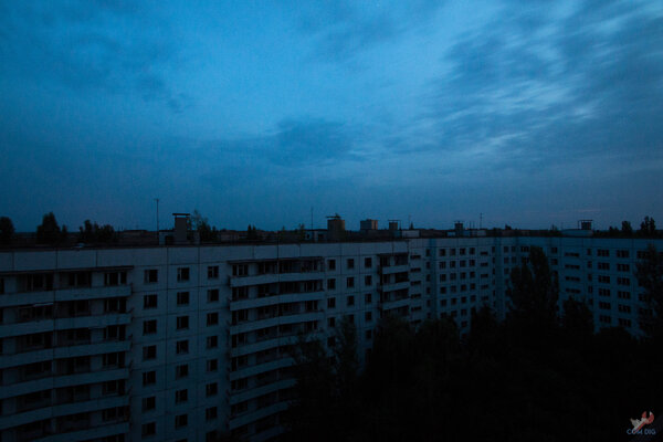 В городе настолько темно, что с земли можно разглядеть зарево от Чернобыльской атомной станции, которая находится примерно в четырёх километрах отсюда.