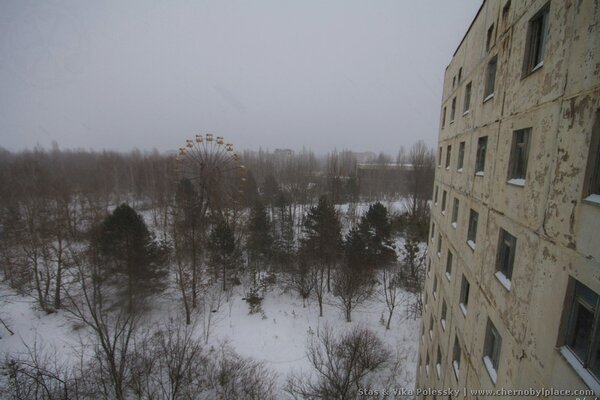 Знаменитый парк аттракционов в 2019 году укрыт снежным саваном. Колесо обозрения, которое так и не успело порадовать жителей, давно превратилось в главный символ этого мёртвого города-спутника. Сейчас это место — магнит для туристов и сталкеров. Многие, впервые попав в Зону отчуждения, стремятся сделать здесь памятный кадр, запечатлев икону забвения.