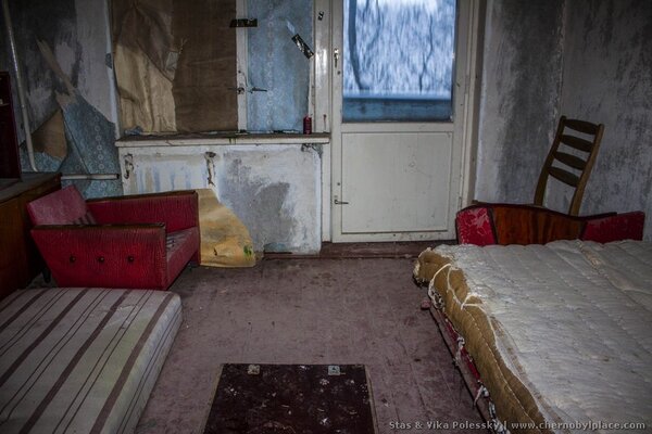 В этой квартире ещё сохранился диван, но обои облупились, а стёкла выбиты.