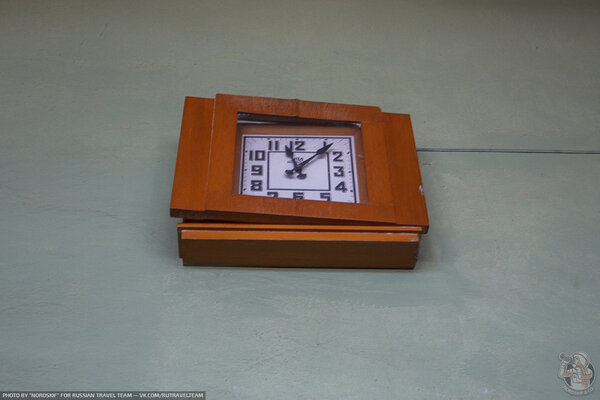 На стене висели заводские часы — очень распространённая в своё время модель, которую наверняка помнят все, кто работал на советских предприятиях. Их тиканье когда-то отмеряло рабочие смены, а теперь они замерли, став немым памятником ушедшей эпохе.