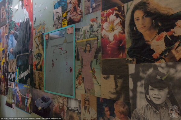 Особый интерес вызвали наклейки в одной из комнат. Это было удивительное смешение образов: герои популярных фильмов, детские картинки, фотографии моделей, изображения машин и даже плакаты с Юрием Шатуновым. Такой своеобразный калейдоскоп вкусов и увлечений работников завода, застывший во времени.