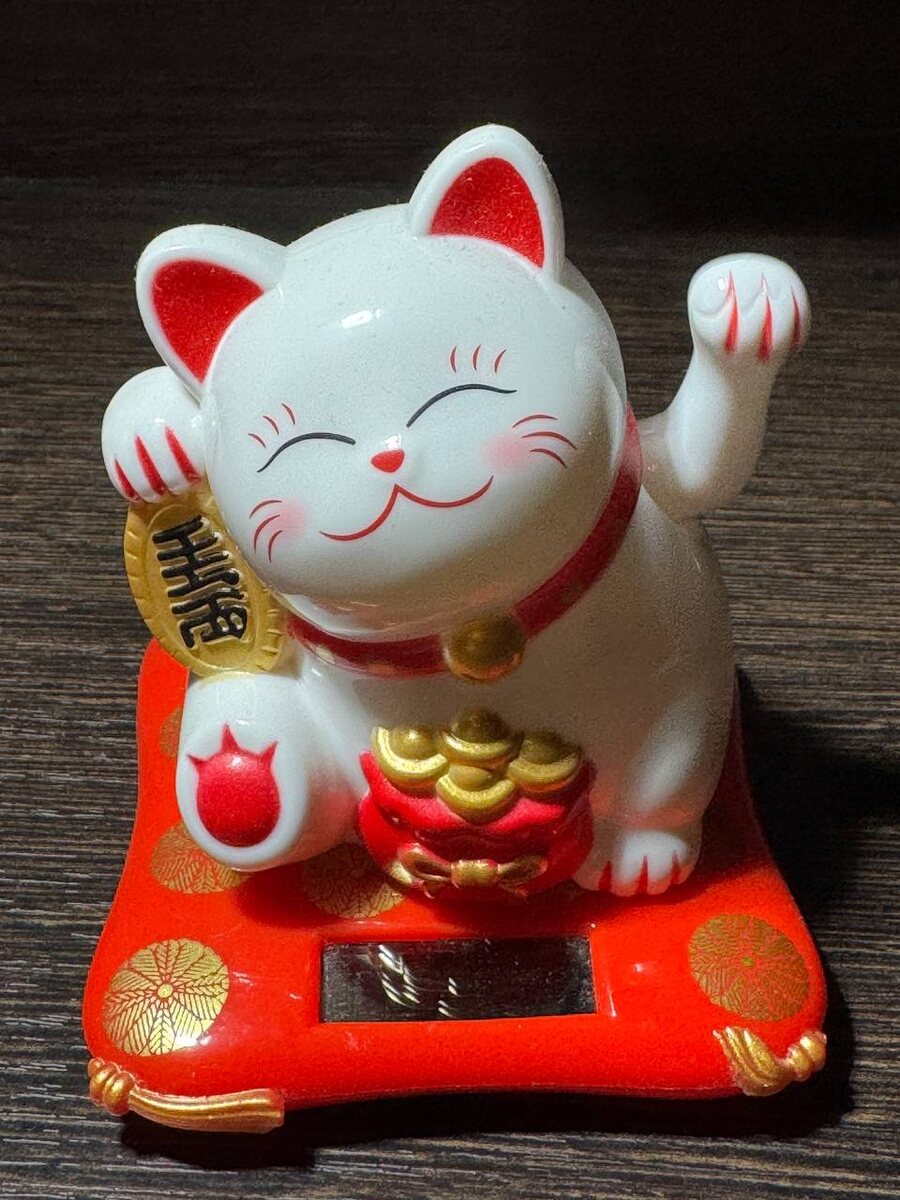 Это японский денежный кот — Манэки-нэко. Считается, что фигурка с поднятой правой лапой привлекает в жизнь богатство и удачу, а с левой — помогает зазывать клиентов. Я, конечно, выбрал вариант для финансового благополучия.