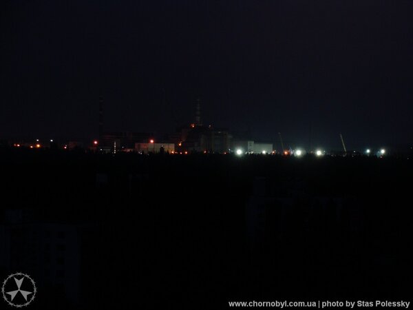 Вдали, на горизонте, мерцает подсветка Чернобыльской АЭС. Несмотря на произошедшее, станция не полностью мертва — там до сих пор трудятся специалисты и охрана, ведутся сложные и долгосрочные работы по её окончательному выводу из эксплуатации.