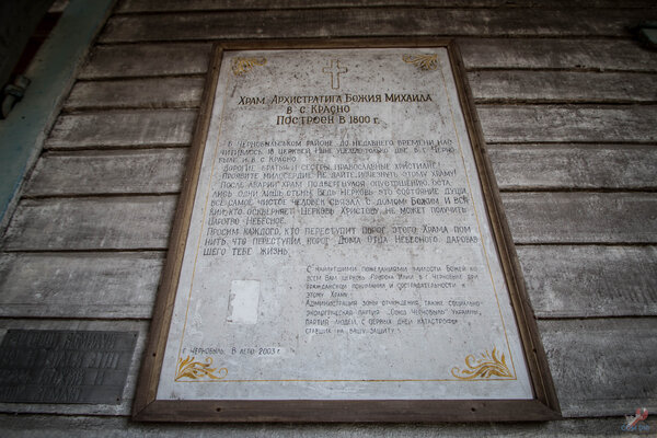 Храм Архистратига Михаила в С. Красно. построен в 1800 году. В Чернобыльском районе до недавнего времени у нас числилось 18 церквей. Ныне уцелело только две. В городе Чернобыле и селе Красно. Дорогие братья и сестры, православные христиане! Проявите милосердие. Не дайте исчезнуть этому храму! После аварии храм подвергся опустошению. Остались лишь одни стены. Ведь церковь это состояние души, вся самое ценное человек связал с домом божьим, и всякий кто осквернит церковь христову, не может получить царство небесное. Просим каждого, кто переступит порог этого храма помнить что переступал порог дома отца небесного даровавшего тебе жизнь. С наилучшими пожеланиями милости божей ко всем. Вам церковь пророка Илии в городе Чернобыле при гражданском понимании и сострадательности к этому храму. Администрация зоны отчуждения, так же социально-экологическая партия "Союз Чернобыль" Украины, партия людей с первых дней катастрофы ставших на вашу защиту. Г. Чернобыль лето 2003.