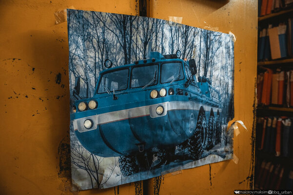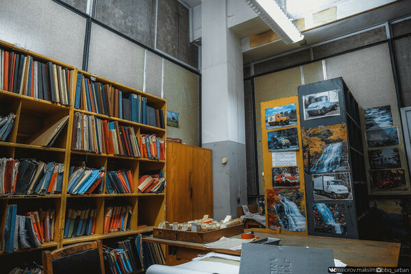 Сразу у входа нас встречают бесконечные ряды стеллажей, заставленные папками, и плакат с изображением знаменитой «Синей птицы» — вездехода ЗиЛ-49061.
