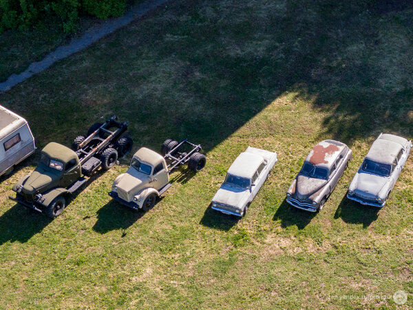 Неподалёку, в зарослях кустов, притаился ещё один небольшой склад с автомобилями. Судя по всему, они дожидаются своей очереди на восстановление и реставрацию.