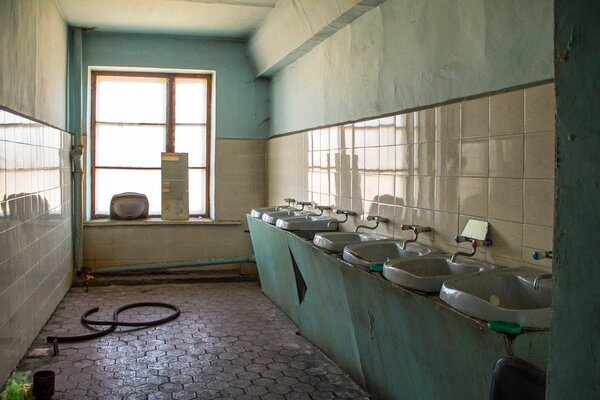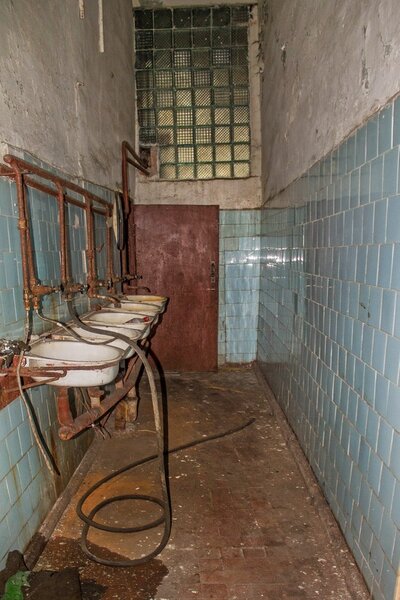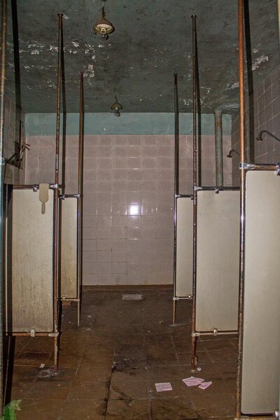 Рядом — душевые, умывальники и туалеты. Всё это создавалось для людей, но теперь в этих комнатах царит лишь тишина и пыль.
