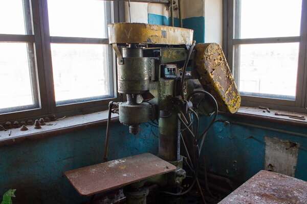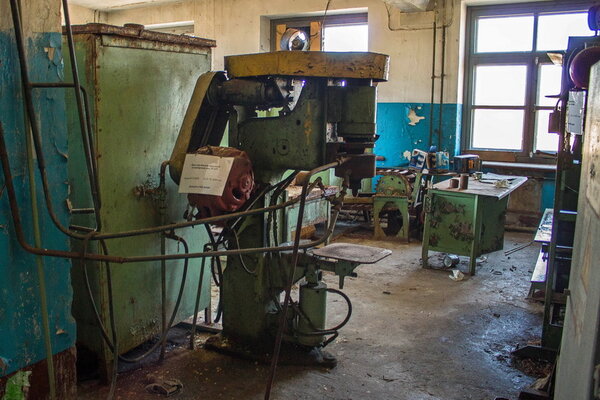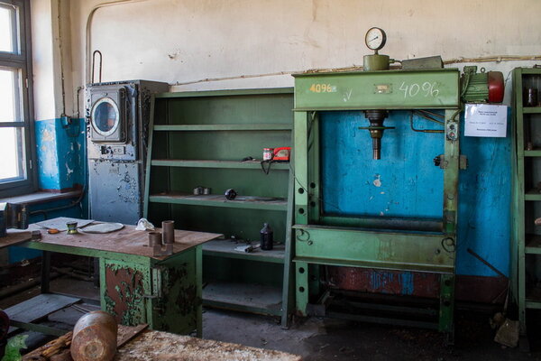 Несколько станков всё ещё стоят на своих местах. Почему-то их не тронули. Среди них — пресс распространённой модели, привычный атрибут многих промышленных предприятий той эпохи.