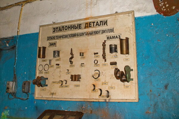 Среди всего этого харжака сложно разобрать назначение некоторых агрегатов. На стенах кое-где сохранились стенды с образцами деталей, напоминающие о специфике производства.