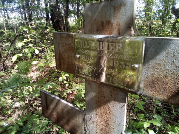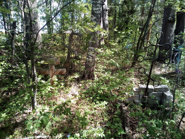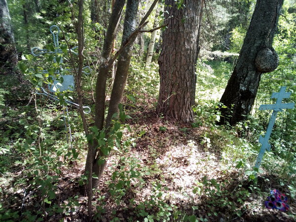 Вот так бывает — в небольшом перелеске у пруда может скрываться целое кладбище. На большинстве крестов не было никаких надписей, идентифицировать захоронения было невозможно. Однако на одном металлическом кресте сохранилась табличка, сообщавшая о двойном захоронении.
