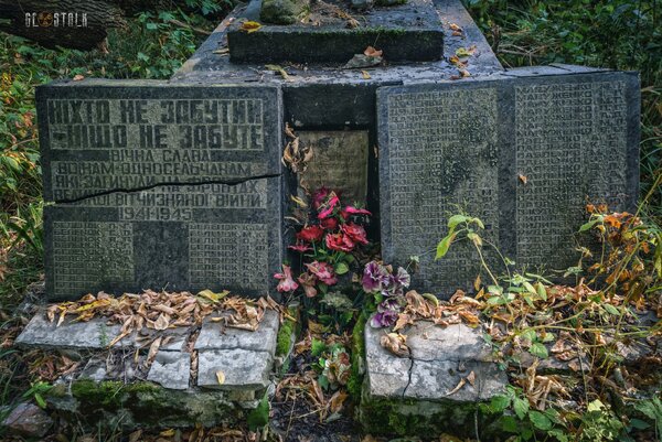 За памятником, видимо, присматривают: расколотая каменная плита аккуратно поставлена на место. Хотя вряд ли камень треснул сам по себе — скорее всего, ему «помогли».