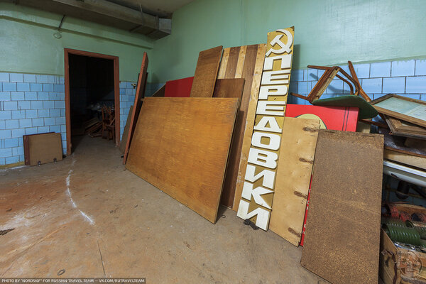 Внутреннее наполнение бомбоубежища оказалось весьма нестандартным. Особенно меня поразило обилие советской агитации — деталей стендов и плакатов, которые, судя по всему, принесли сюда с территории завода.
