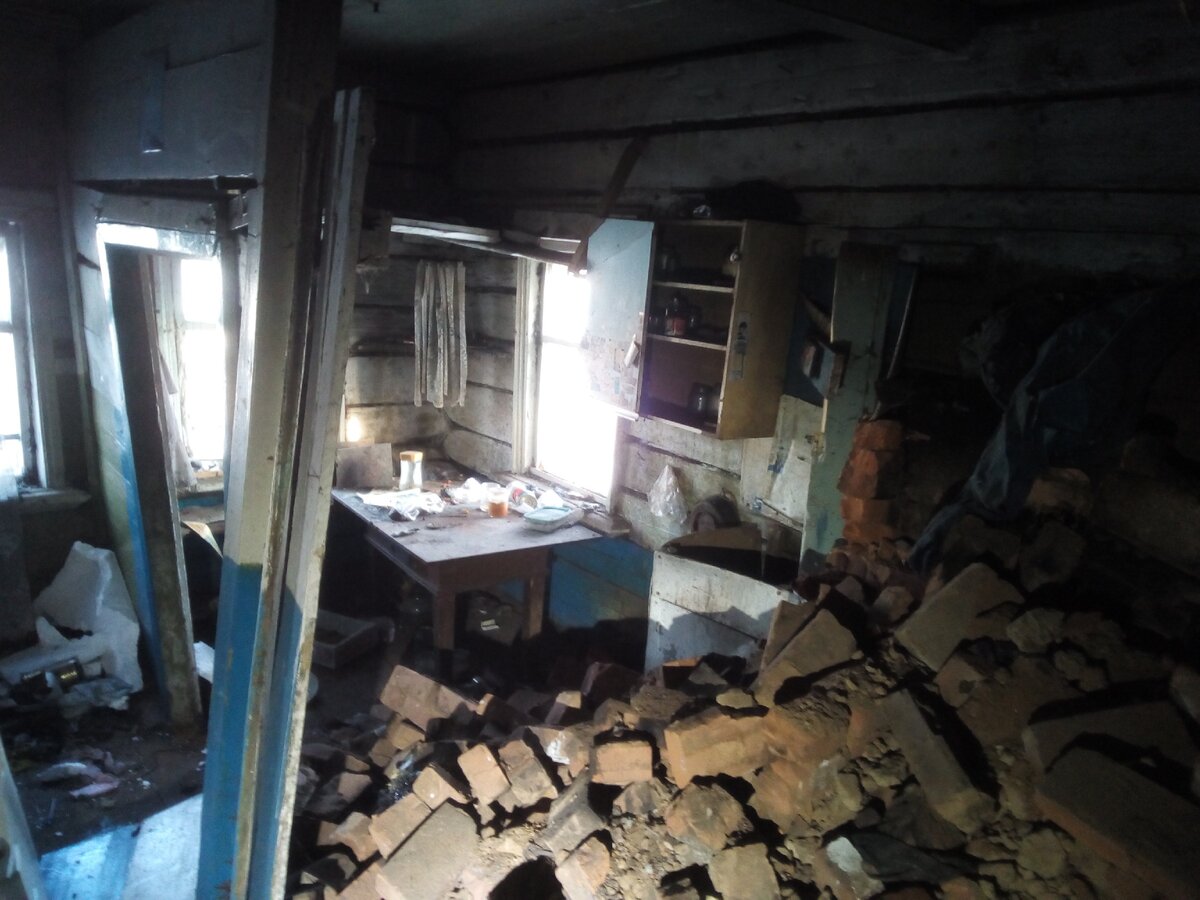 Вот так сейчас выглядит один из домов, который ещё недавно был закрыт. Для многих охотников за трофеями главной добычей становится «печное железо» — металлические элементы печей, которые весят немало и могут принести хорошие деньги при сдаче. Из заброшенных домов вытаскивают весь металл, который только можно унести.