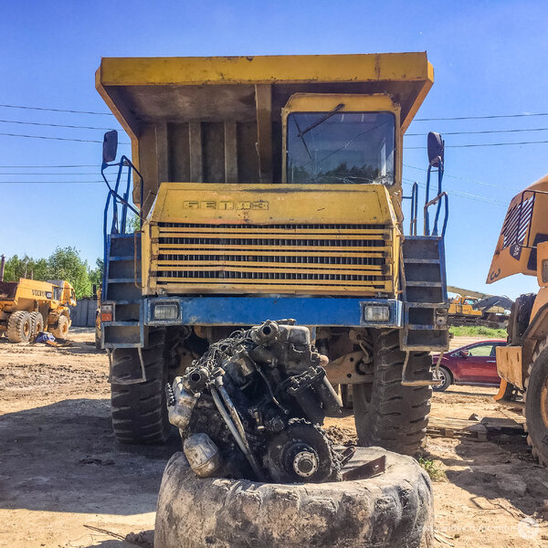 Рядом с современными Volvo ремонтируют уже не столь новые Белазы. На фото — модель 7548, которая в эпоху развитого социализма была настоящей «рабочей лошадкой» на крупных стройках, особенно гидротехнических объектов СССР. Его грузоподъёмность составляет 42 тонны.