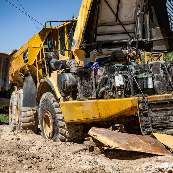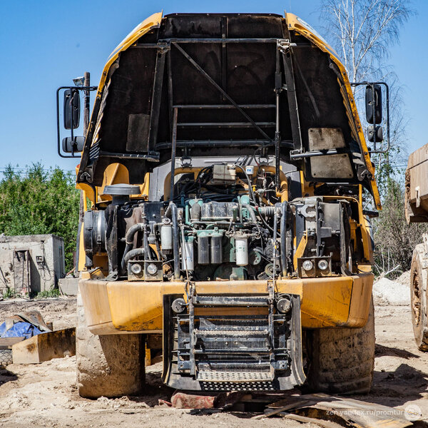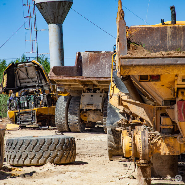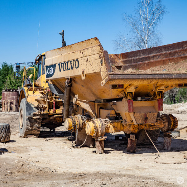 Техника здесь действительно внушительных размеров. Особенно много шарнирно-сочленённых самосвалов Volvo A35D, которые находятся в разной степени разборки. Их конструкция напоминает наш тяжёлый трактор «Кировец»: две рамы, на одной из которых размещены кабина и двигатель, а на другой — кузов.