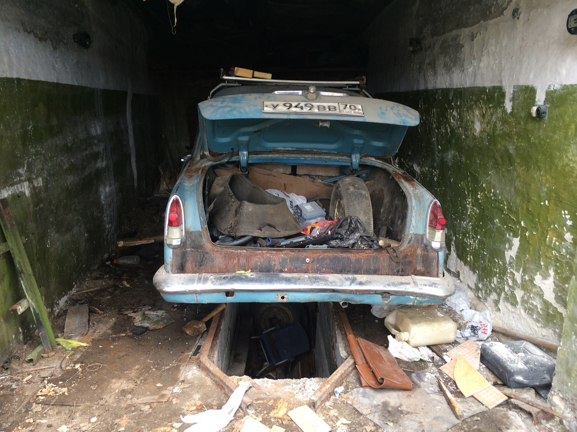 Это был ГАЗ-24, который, судя по всему, провёл в этом гараже не один десяток лет. Краска облезла, кузов покрылся рыжими пятнами коррозии. Скорее всего, машина принадлежала пожилому человеку, который ушёл из жизни, а автомобиль просто забыли.